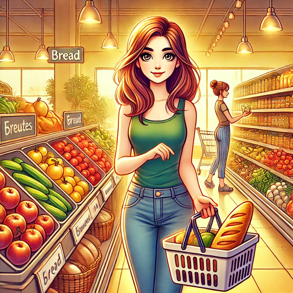 Anna ist 22 Jahre alt. Sie lebt in Berlin und arbeitet in einem kleinen Café. Heute ist Sonntag. Anna hat frei und möchte einkaufen gehen. Sie braucht Obst, Gemüse, Brot und Milch.